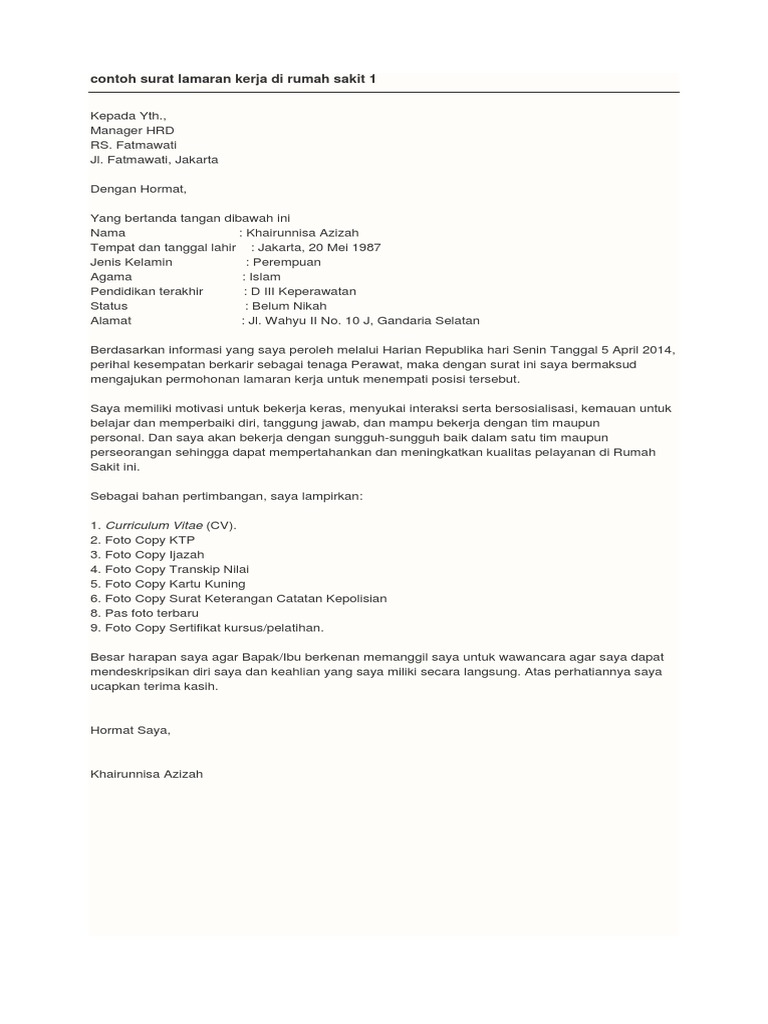 Perawat contoh surat lamaran kerja rumah sakit. We did not find results for: Check spelling or type a new query. Maybe you would like to learn more about one of these?